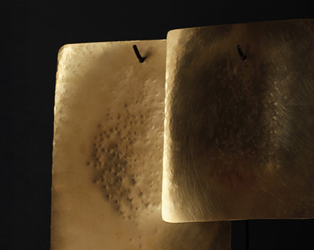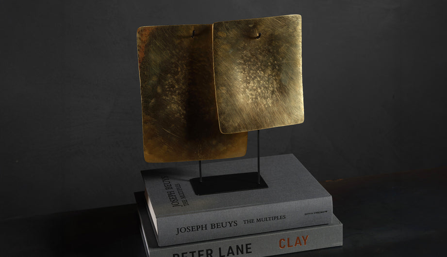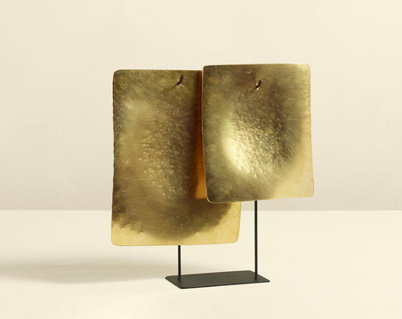 Robert Lee Morris’s iconic sails motif is a meditation on breath. Two hand-forged brass plates with convex and concave design feel wind-filled, positioned on a black metal base. Each sculpture is handmade; expect unique variations and marks of character.