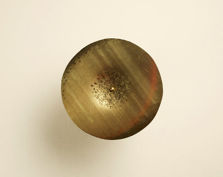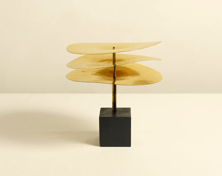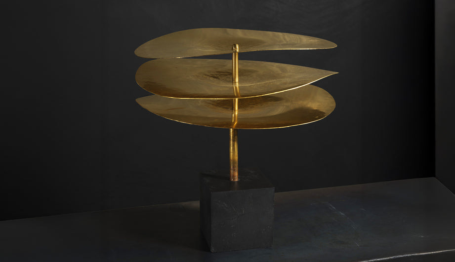 This sculpture celebrates the iconic Robert Lee Morris’ sails motif, inspired by his long career in jewelry design. Hand-forged brass discs are balanced on top of a black wooden base, the natural variance of the shapes creating subtle reflections and refractions of warm light.