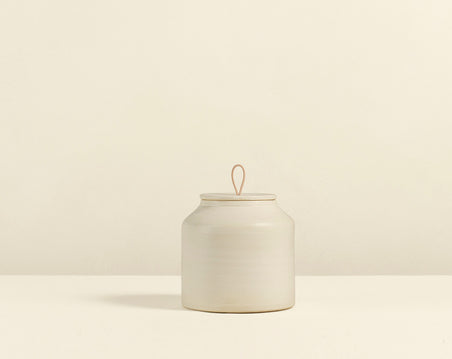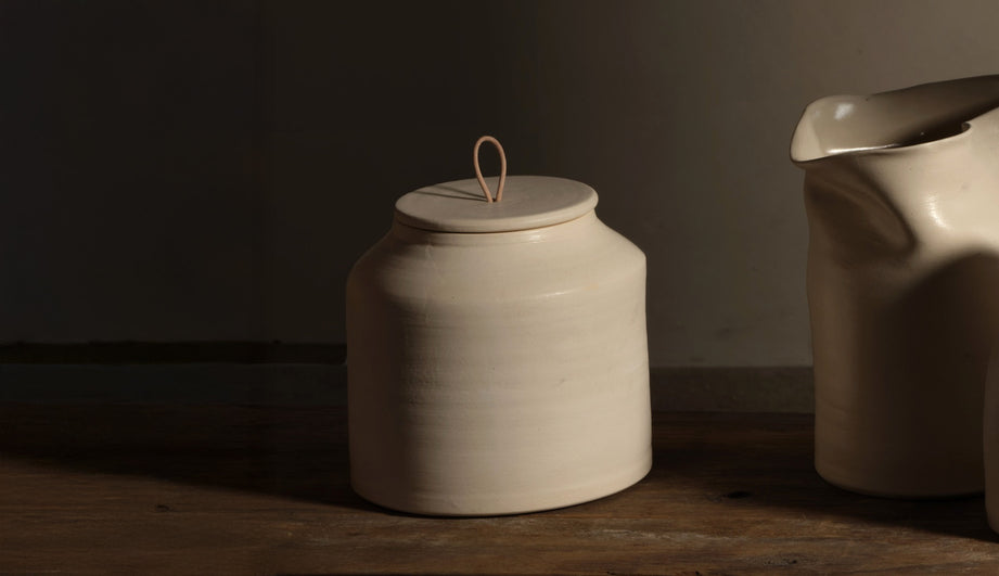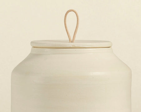 Using traditional techniques, San Francisco artist Sasinun Kladpetch arrives at a contemporary reinvention of form in these grand cylindrical canisters with leather cord loop handles that remain natural and precise, functional and special. Available in three sizes and two finishes.