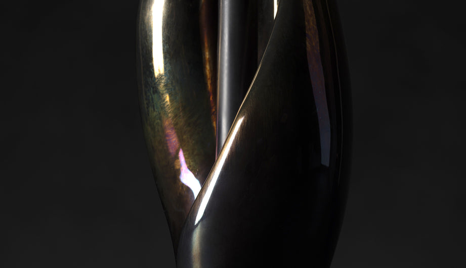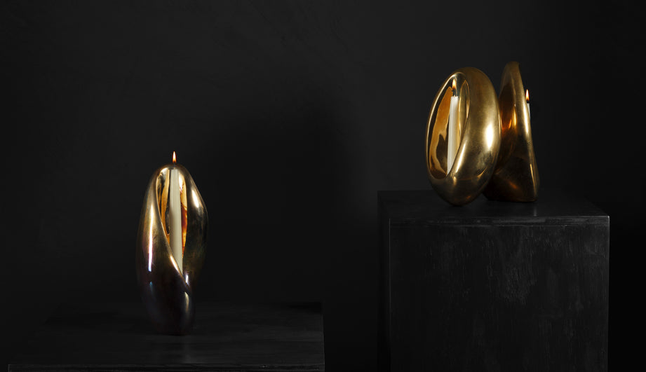 This bronze candle holder series references the cycle of life, an iconic motif and theme from Rogan Gregory, reflecting on humanity, impermanence, and perpetual renewal. Gregory leaves each piece unsealed, an invitation for it to take on its own unique character, shifting and changing with the alchemy of light, touch, and time. Available in two sizes—a single-taper size featuring a gentle chromatic patina, and a fully-polished two-taper size.