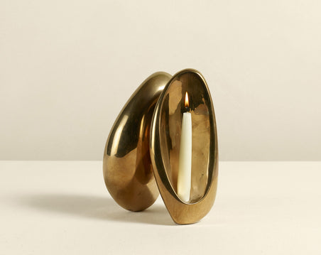 This bronze candle holder series references the cycle of life, an iconic motif and theme from Rogan Gregory, reflecting on humanity, impermanence, and perpetual renewal. Gregory leaves each piece unsealed, an invitation for it to take on its own unique character, shifting and changing with the alchemy of light, touch, and time. Available in two sizes—a single-taper size featuring a gentle chromatic patina, and a fully-polished two-taper size.