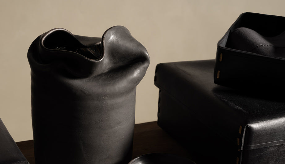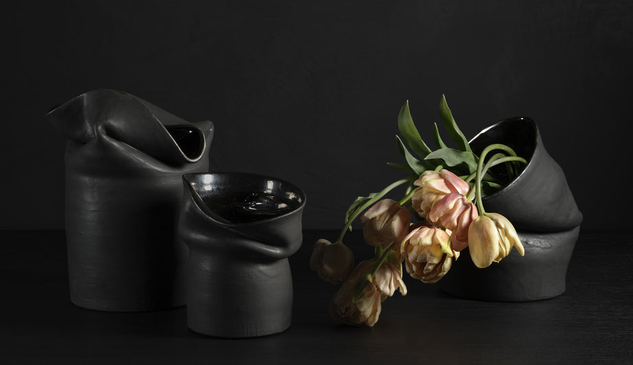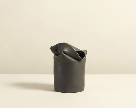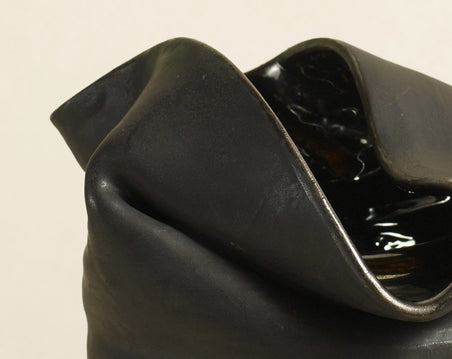 Each textured stoneware vessel is made of ceramic, with a tubular base rising to an intentionally collapsed opening. Every vessel by Sasinun Kladpetch is a journey of discovery, each piece in the series is unique, animated by spontaneity and intention. Available in three sizes and two finishes.