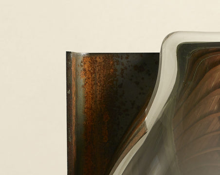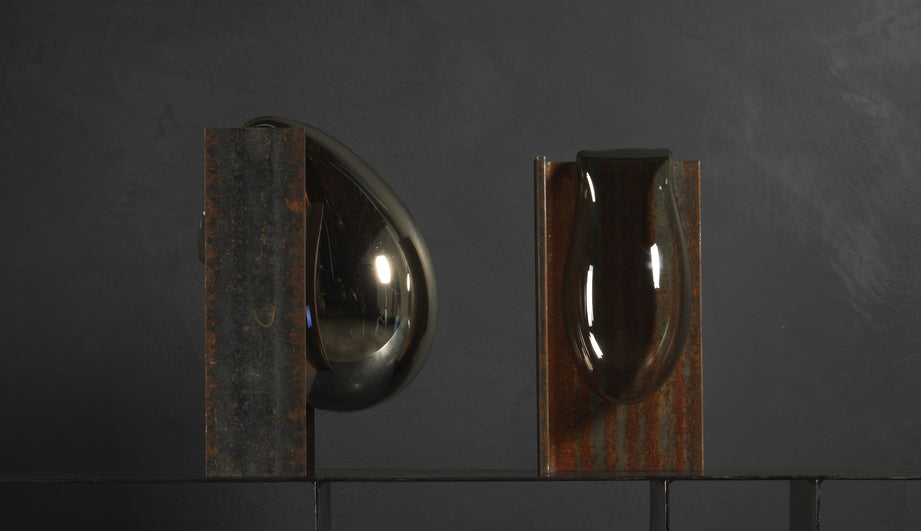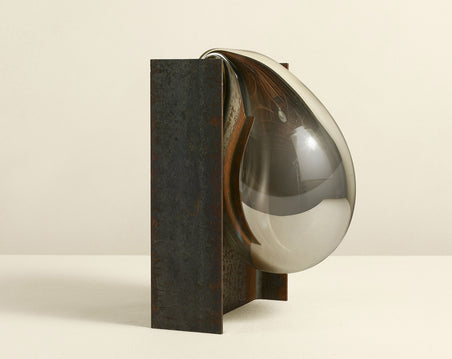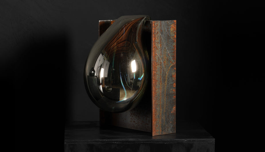 Created by Lisa Sacco at the renowned Corning Museum of Glass, this series mixes industrial objects with new forms. Mouth-blown glass with a mirrored finish creates an interplay with unfinished reclaimed steel I-beams, resulting in a bold statement of raw minerals. Limited edition, five available.