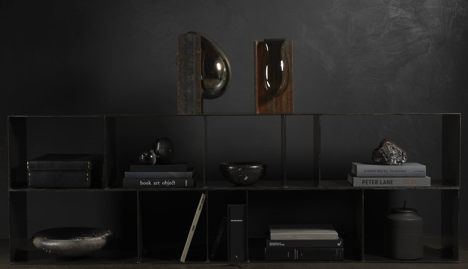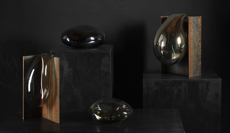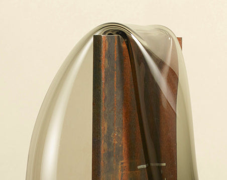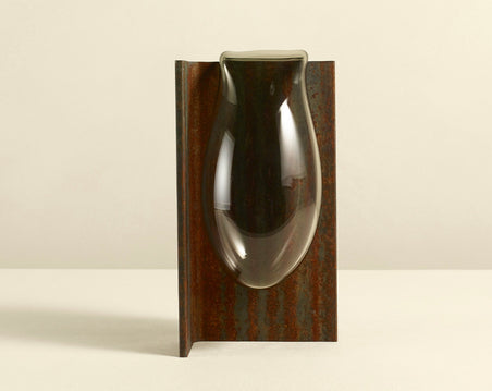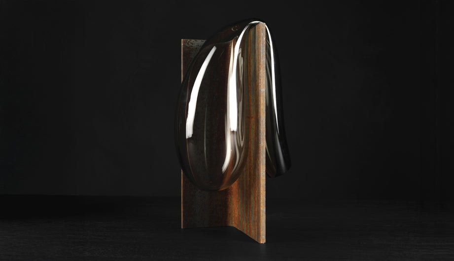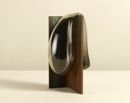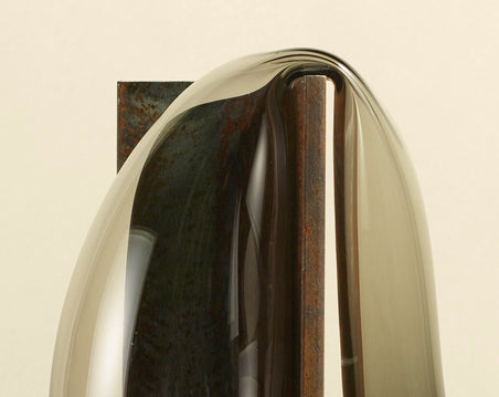 This limited-edition sculpture by Lisa Sacco balances the organic with the industrial. This tall, sleek interpretation of reclaimed steel and sheer black mouth-blown glass meets at the intersection of fragile and permanent. Created at the Corning Museum of Glass in New York State. Limited edition, five available.