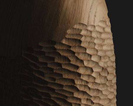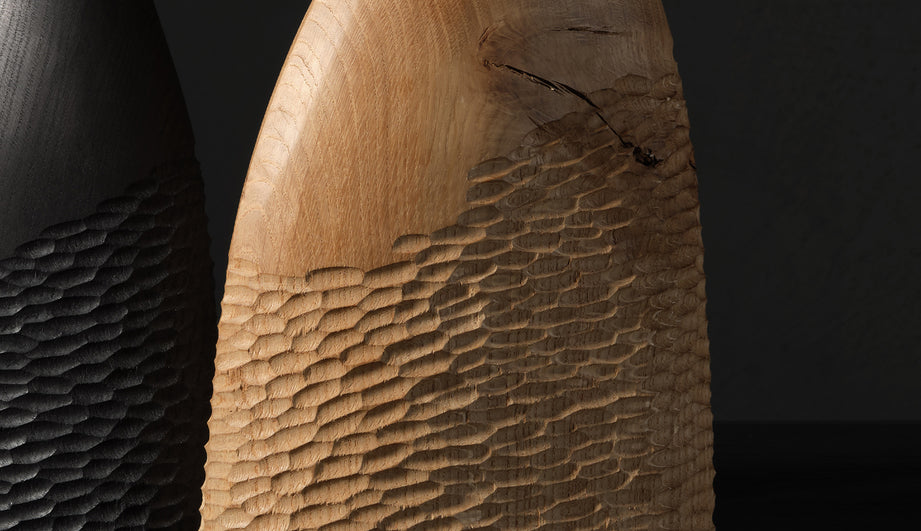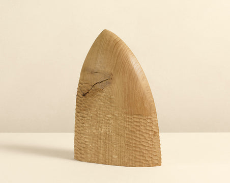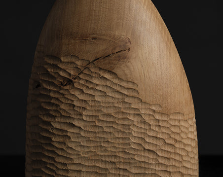 Carved and chiseled entirely by hand in French oak, this sculpture lives harmoniously with the Totem Oak Sculpture or stands proudly on its own. Maxime Perrolle makes each individual gauge of the wood by hand using traditional tools, paying tribute to past masters of woodworking. Available in two finishes.
