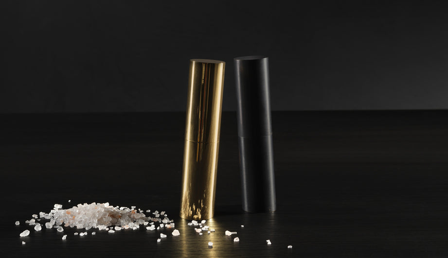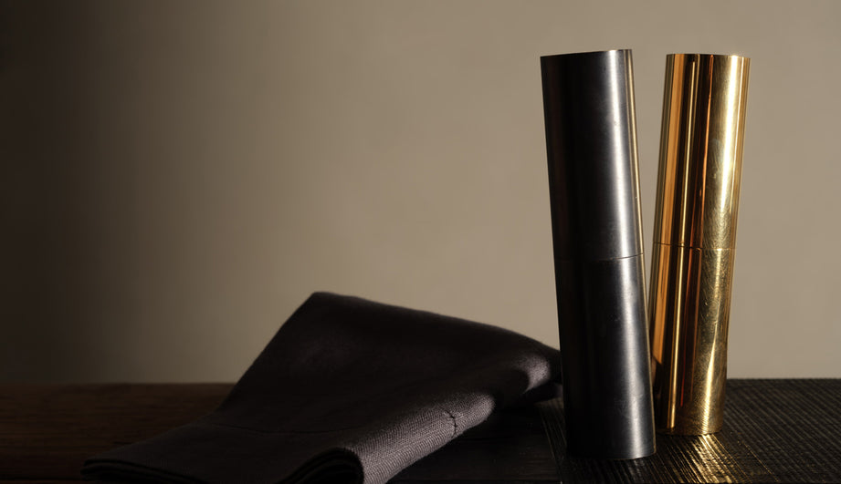 Lightly canted and minimalist in style, this purpose-designed italic mill from Michael Anastassiades is a functional art object for the tabletop. Produced in the workshop of iconic Austrian designer Carl Aubock, two interlocking counter-rotating gears grind fresh pepper, salt or other dried spices, stored in the base. Available in two finishes.