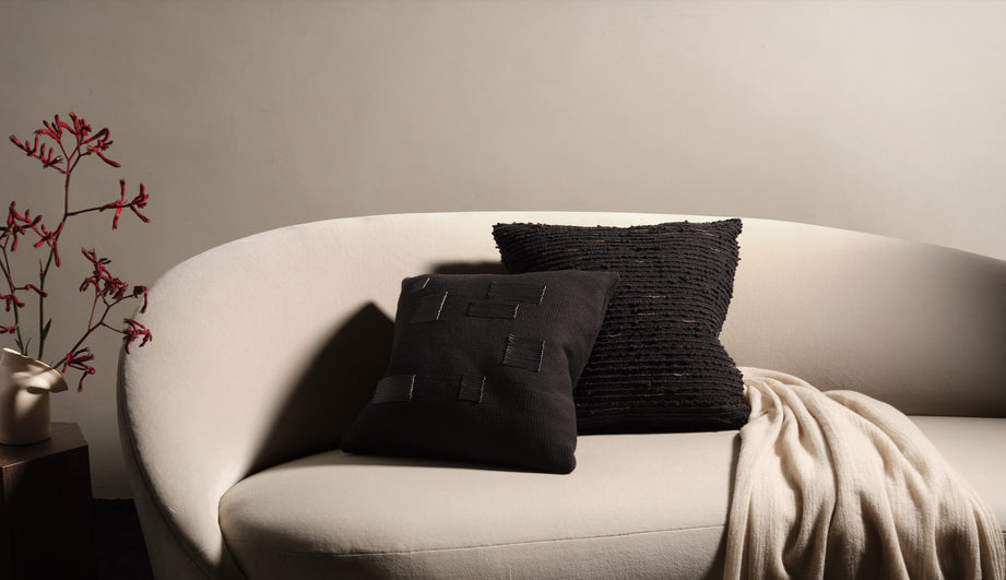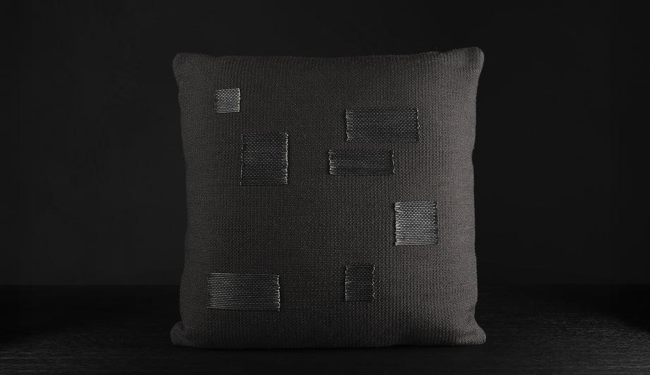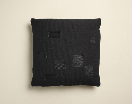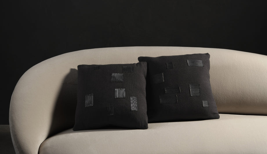 Hand-spun merino wool yarn and corded leatherwork form a monochromatic pattern that is both playful and structured. Each step in the process of creating these decorative pillows was achieved by hand—dying, cutting, and weaving on traditional floor looms—resulting in Dougall Paulson’s first bespoke textile series. One size.