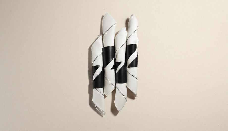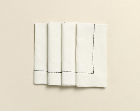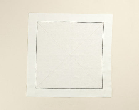 Strong, smooth, and lustrous, these Irish linen napkins by Peter Speliopoulos feature delicate black hem-stitching done by hand. Their grace and softness belies their utility as an object of use and reuse. Available in four colors with coordinated stitching.
