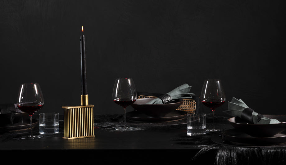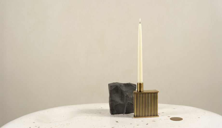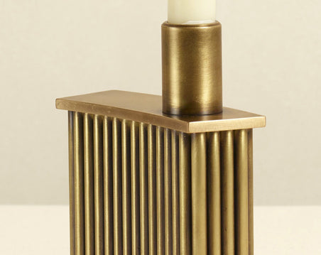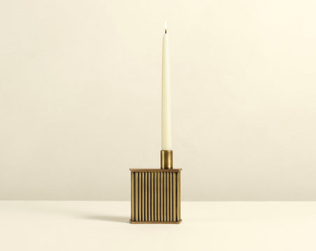 Holding a single taper, this fluted david/nicolas architectural candle holder has an outsized presence. The offset silhouette and brass finish are cinematic and intimate.