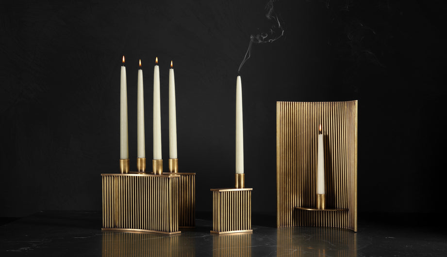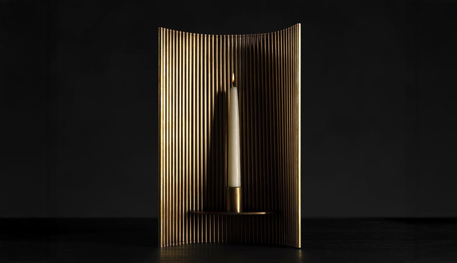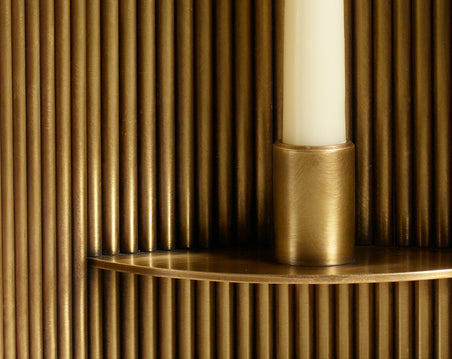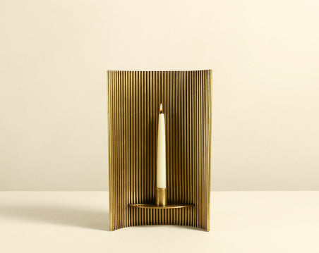 With a subtle bend and curve, candlelight refracts off of this patinated brass wall sconce. Part of the david/nicolas textured brass series, it brings a modern aesthetic beyond the confines of tabletop, reinventing the theme for new spaces and contexts.
