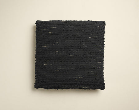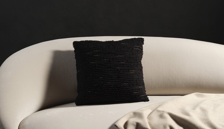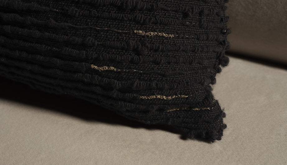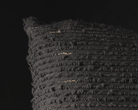 By interspersing hand-spun merino wool with gold-wrapped Japanese silk thread, Dougall Paulson highlights metallic texture against a traditional weave. Seeing materials as an equal studio partner enables the artists to achieve spontaneity in every creation, making each pillow one-of-a-kind. One size.